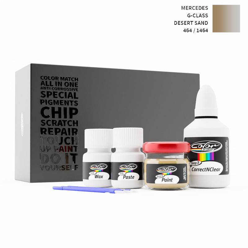Neem afscheid van steenslag en krassen op uw Mercedes G-Class Desert Sand 1464 / 464. Met gepatenteerde Duitse technologie lost Color N Drive uw probleem op in 3 eenvoudige stappen. Elke KIT wordt op maat bereid volgens de originele lakkleur van uw fabrikant.