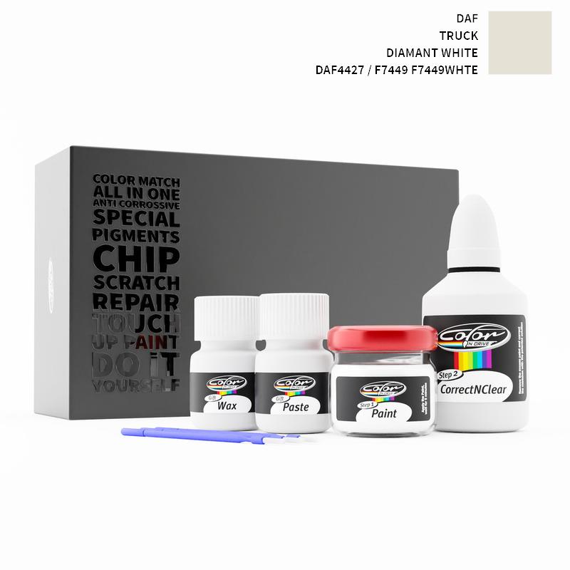 Sig farvel til stenslag og ridser på din DAF Truck Diamant White DAF4427 / F7449 F7449WHTE. Med patenteret tysk teknologi løser Color N Drive dit problem i 3 enkle trin. Hvert KIT er specialfremstillet i overensstemmelse med din bilproducents originale lakfarve.
