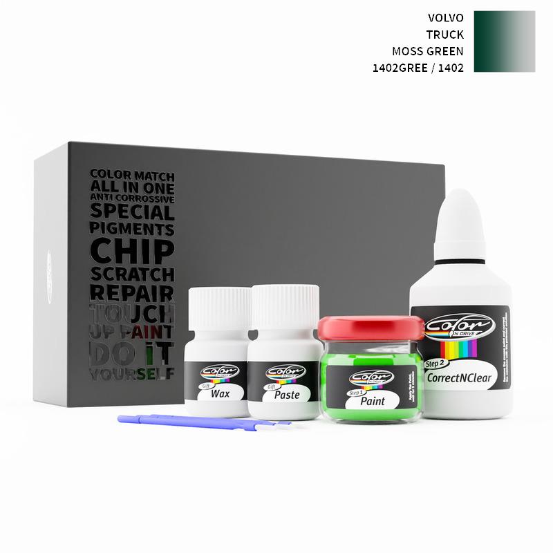 Sig farvel til stenslag og ridser på din Volvo Truck Moss Green 1402 / 1402GREE. Med patenteret tysk teknologi løser Color N Drive dit problem i 3 enkle trin. Hvert KIT er specialfremstillet i overensstemmelse med din bilproducents originale lakfarve.