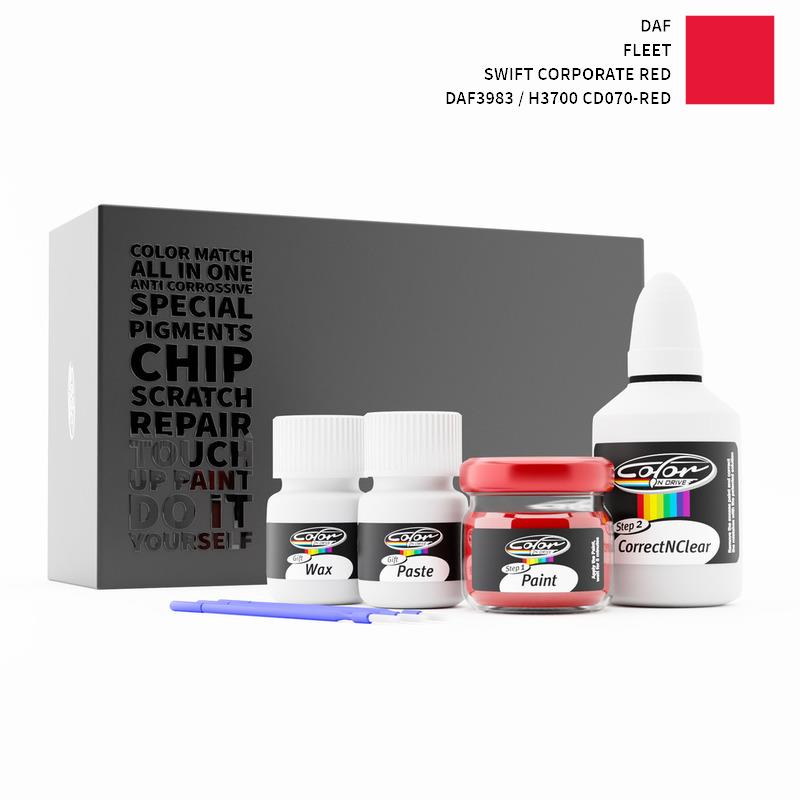 Si ha det til steinsprut og riper på din DAF Fleet Swift Corporate Red DAF3983 / H3700 CD070-RED. Med patentert tysk teknologi løser Color N Drive problemet ditt i 3 enkle trinn. Hvert KIT er spesialtilvirket i samsvar med bilprodusentens originale lakkfarge.