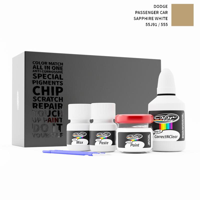Si ha det til steinsprut og riper på din Dodge Passenger Car Sapphire White 555 / 55J91. Med patentert tysk teknologi løser Color N Drive problemet ditt i 3 enkle trinn. Hvert KIT er spesialtilvirket i samsvar med bilprodusentens originale lakkfarge.