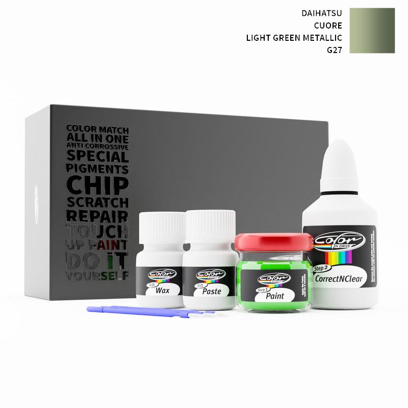 Säg hejdå till stenskott och repor på din Daihatsu Cuore Light Green Metallic G27. Med patenterad tysk teknologi löser Color N Drive ditt problem i 3 enkla steg. Varje KIT specialtillverkas enligt din biltillverkares originalfärg.